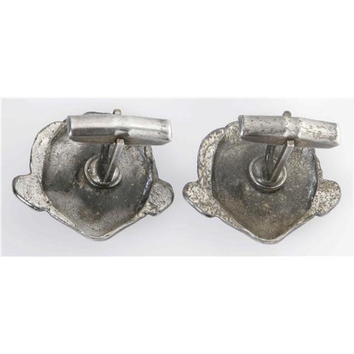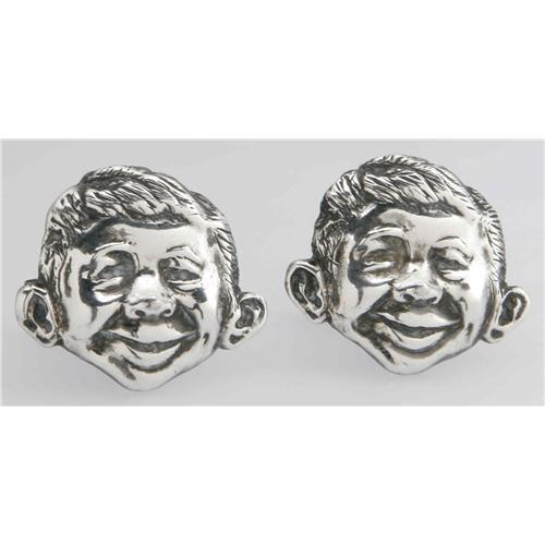 <B>Mad Cuff Links, Set of 2 (1957)</B></I>. When these were first offered in issue #33, the Usual Gang of Idiots plugged them thus: "If you wear these 'What ... Me Worry?' Kid cufflinks with long-sleeved shirts, you'll impress your friends. If you pierce your wrists and wear them with short-sleeves shirts, you'll kill your friends!" Despite this hype and being manufactured in "stunning satin silver plate," obviously few fans sent in their three dollars, as these are extremely rare today. While these have evidently been used, the fronts (with Alfred's face) look outstanding, and only very minor wear is evident on the rear.