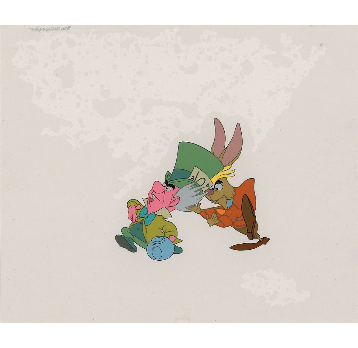 (Walt Disney Studios, 1960) Original production cel featuring Alice in Wonderland’s Mad Hatter and March Hare from the finale of the 148th episode of the television show Walt Disney Presents, titled ‘This Is Your Life, Donald Duck.’ The cel is slightly trimmed to 12.5 x 10.5. Image measures 5 x 5. In fine condition.