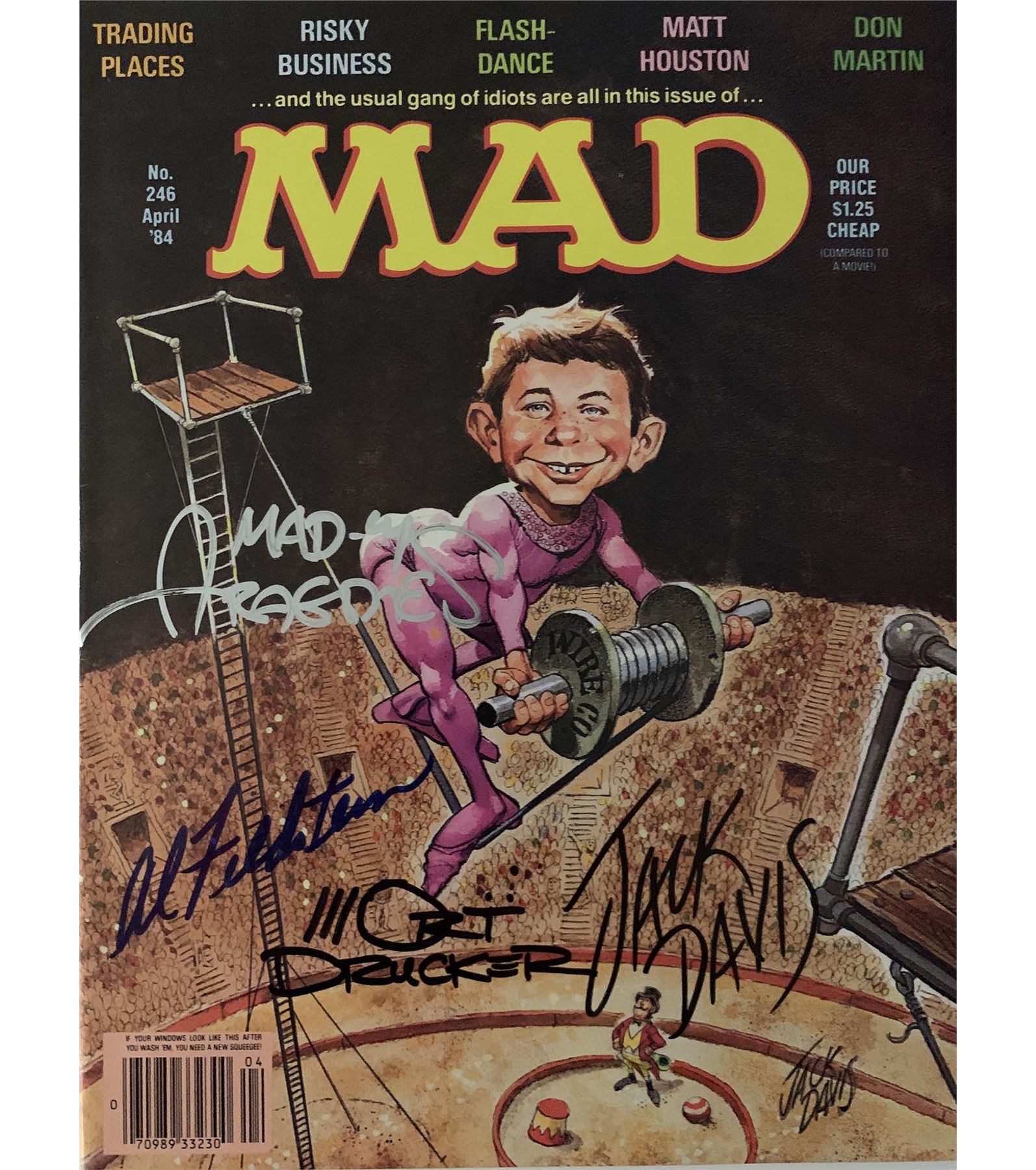 Mad signed magazine autographed by Jack Davis, Sergio Aragones, Al Feldstein and Mort Drucker. 8x11 inches