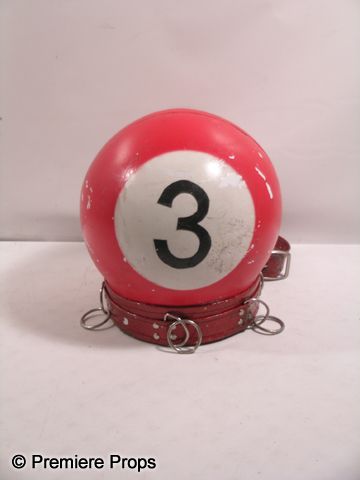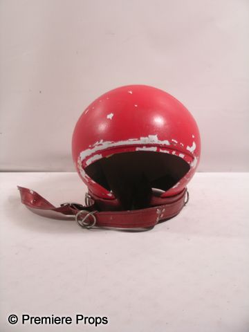 From the film that started Mel Gibson's career, this is a prop 'pool cue' helmet used during the filming of the original Australian sci-fi classic 'Mad Max' (1979). The helmet was worn by one of the background bikers who roam the Australian wasteland after a nuclear war. The helmet is made from thin plastic and painted red, with a number '3' applied to the reverse with black tape. Helmet has a slab of foam inside for comfort, and a red sparkle collar that fastens into a chin strap, with attached dangling steel rings. The paint is chipping off on some places. (measures approx. 12"x 11")