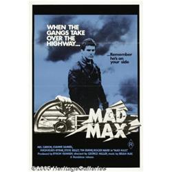<B>Mad Max (Roadshow Film Distributors, 1979)</B></I> Australian One Sheet (27" X 40"). The first of the series that made Mel Gibson famous internationally, this is one of the hardest-edged films ever shot. From the spectacular car crashes (among them director George Miller's personal van) to the horror of Max watching as the biker gang kills his wife and child, this film takes no mercies with its characters or audience. The final scene with the villain's choice of sawing through tempered steel handcuffs or through the muscle and bone of his leg, as the bomb ticks, leaves you with one final chill before the credits roll. A very nice country-of-origin poster, this Australian one sheet has a good image of a brooding Gibson. Slight fold wear, faint diagonal wrinkles and a few tiny scuffs. Otherwise, a near mint poster. Very Fine/Near Mint.