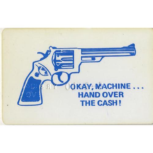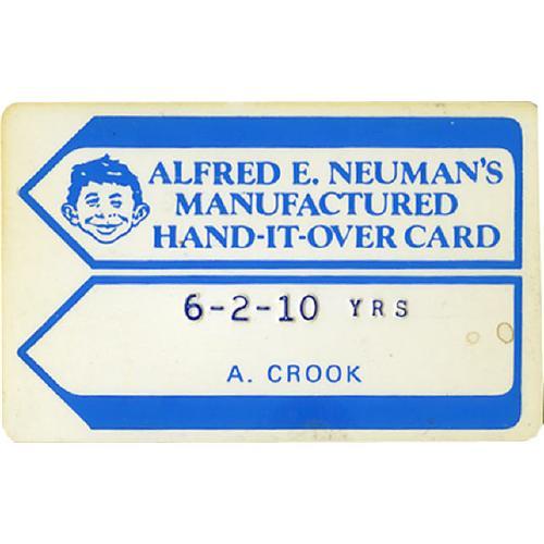 <B>Mad Promotional Items Lot of 3.</B></I> We give you a plastic "auto teller hold up" card -- and no, we won't post bail if you use it (it identifies you to your ATM as A. Crook)! We also give you "Alfred's Mad Memo Pad" and a bundle of 17 <B>Mad</B></I> three-dollar bills. These promotional items were most likely used for trade shows and the like. The book <B>Collectibly Mad</B></I> noted, "many of them were the brainchildren of Dick DeBartolo." So note that these are from the personal collection of that writer extraordinaire! None of the items have more than minor wear; the memo pad appears to be complete. <I>From the Personal Collection of Dick DeBartolo</B></I>.