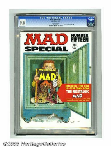 <B>Mad Special #15 (EC, 1974) CGC NM/MT 9.8 Off-white pages.</B></I> Contains comic book <B>The Nostalgic Mad</B></I> #3. Overstreet 2005 NM- 9.2 value = $30. CGC census 1/05: 2 in 9.8, none higher. <I>From the collection of Chris Bell.</B></I>