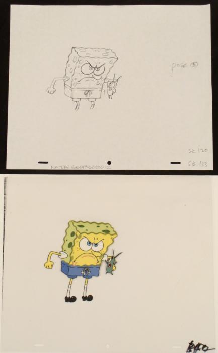 This original animation cel is from the Nickelodeon TV show SpongeBob Squarepants. The story takes place under the deep blue sea in Bikini Bottom, where SpongeBob resides. SpongeBob, who is a yellow, porous sponge, is your typical happy-go-lucky character, as he is always cheerful and enjoys making people laugh. Patrick Star, SpongeBob's neighbor who is a starfish, is your average children's show idiot, as he boasts knowing nothing and is often getting himself into ridiculous situations. Between the homes of these two lies the home of the miserable Squidward, a squid, who is known for being grouchy and playing tricks on SpongeBob and Patrick. Both SpongeBob and Squidward work at the Krusty Krab, a fast food business run by the greedy money-loving Mr. Krabs, a crab, the arch rival of the evil, possibly misunderstood, Plankton. Another neighbor, Sandy Cheeks, an athletic squirrel who normally wears an astronaut's space suit, was introduced in "Tea at the Treedome." She spends most of her time inventing and experimenting. SpongeBob looks mad and PlanktonOriginal Production Animated Cel and Drawing Original "rough" animation drawing, in black pencil, with notations in black. Overall Size of Drawing: 10 1/2" x 12 1/2" Overall Size of Cel: 10 1/2" x 12 1/2" Excellent ConditionThis is an original hand-painted cel set-up used in the production of an episode of "SpongeBob SquarePants." Each one-of-a-kind set-up represents a slight change in position of the characters. When individually photographed and projected in rapid succession, the images appear to move.