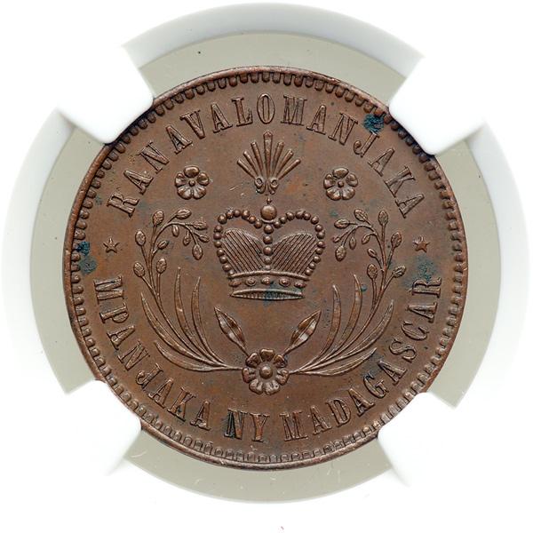 Madagascar. 10 Centimes, 1883-E. KM-X#1; Gad-4. Bronze. Essai. Fantasy coinage. Ranavalona III, 1883-1897. Crown within wreath. Reverse: Value and date within wreath, E on star for Essai. Couple of minor corrosion spots. NGC graded MS-62 Brown.