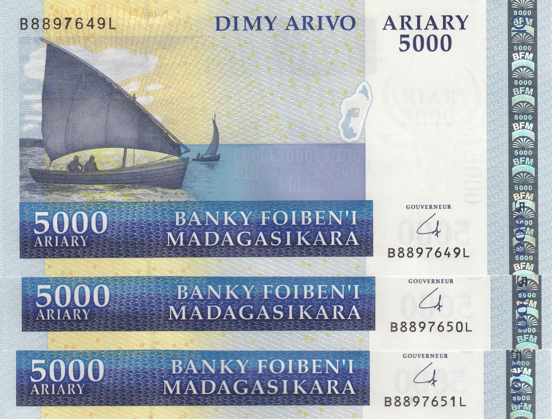 Madagascar, 5.000 Ariary, 2008, UNC, p93, (Total 3 consecutive banknotes)br/serial numbers. B8897649