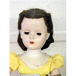 Beautiful, bright, circa 1953 18" Madam Alexander Fashion Academy Doll. Hard plastic straight leg walker body, Formal yellow gown with original tag and stockings, shoes and Fashion Academy Award Tag.