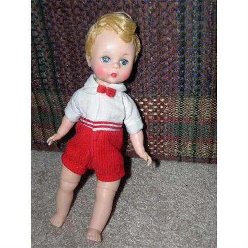 Here is an 8" Madame Alexander Boy with an Alexander-kins tagged red and white suite.