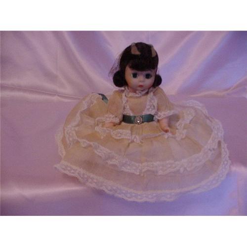 Madame Alexander doll "Scarlet" 7 1/2" tall, plastic body movable arms and legs and eyes that open and close. Wheat color dress with lace trim and green sash and bow in back. dress a bit discolored but not ripped. Makers tag shown.