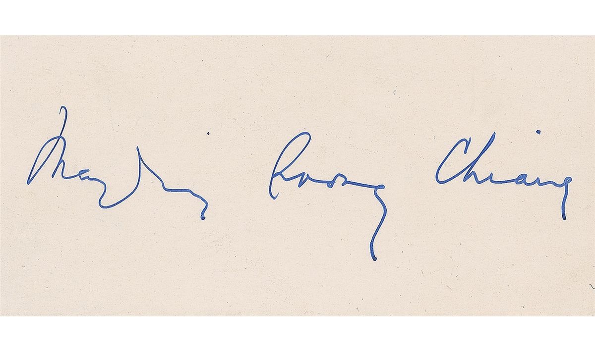 First lady of President Chiang Kai-shek (1898–2003), also known as Madame Chiang, who was the youngest and last surviving of the three Soong sisters; played a prominent role in the politics of the Republic of China. Crisp ink signature of Madame Chiang in English, “Mayling Soong Chiang,” on an off-white 4.5 x 2.25 cardstock slip. In fine condition.