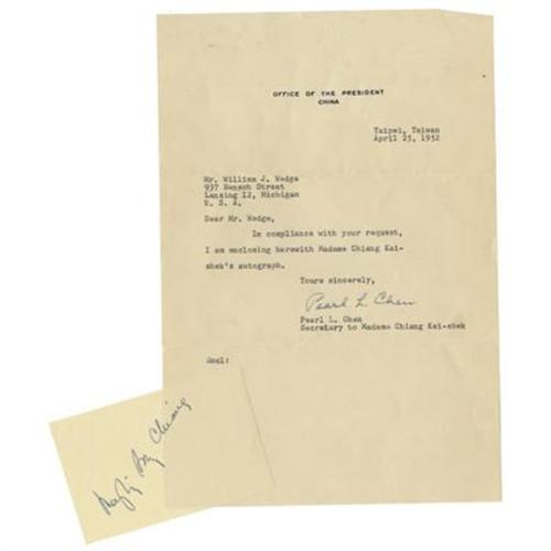 <B>Madame Chiang Kai-shek Signature</B></I> “<I>Mayling Soong Chiang</B></I>”. 4.25” x 3.75”, in ink, fine condition with a one page typed letter on Office of the President China letterhead, 7.25” x 10.5”, April 25, 1952, signed by Madame Chiang's secretary, Pearl L. Chen, with the original envelope, fine condition. Madame Chiang graciously honors a request for an autograph, and transmits it through her secretary to a collector in Lansing, Michigan. <BR><BR><b>Shipping:</b> Flat Material, Small (<a target="_blank" href="http://www.heritageauctions.com/common/shipping.php">view shipping information</a>)