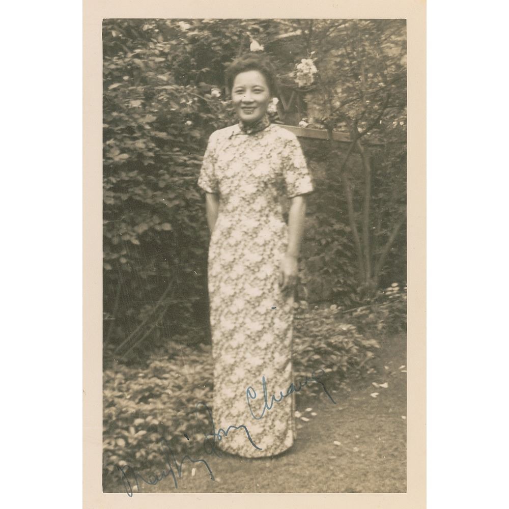Vintage matte-finish 4 x 6 candid photo of Madame Chiang in a nice full-length pose, signed in fountain pen, "Mayling Soong Chiang." A notation on the reverse indicates that the photograph was taken on June 15, 1945. In fine condition.