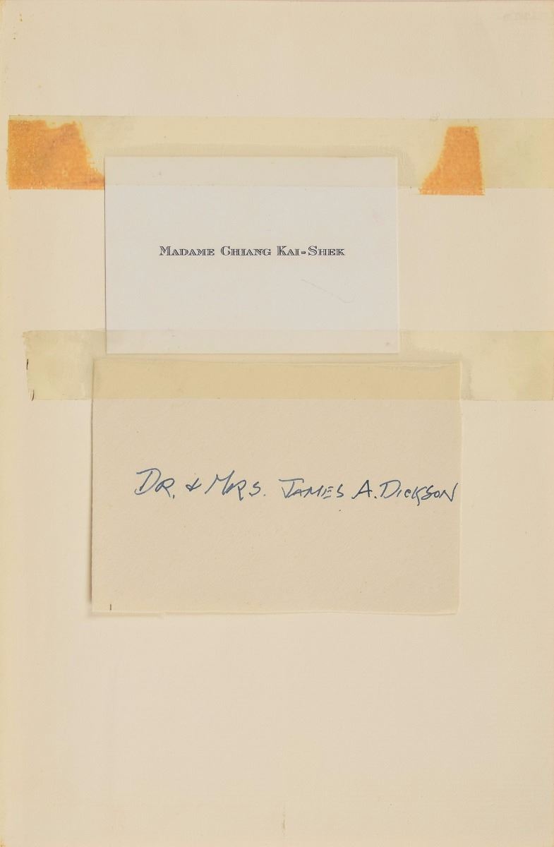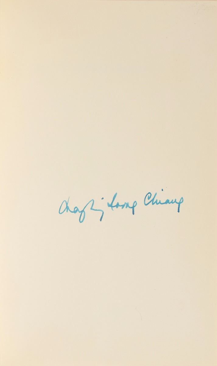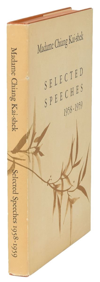 Signed book: Selected Speeches, 1958–1959. Taipei, Taiwan: The Office of the President, 1959. Hardcover with dust jacket, 6.25 x 9.5, 187 pages. Nicely signed on a free end page in fountain pen, "Mayling Soong Chiang." Her personal calling card and a transmittal panel are taped to the first free end page. Autographic condition: fine. Book condition: VG/VG.
