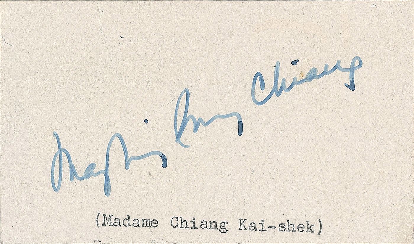 Fountain pen signature, "Mayling Soong Chiang,” on an off-white 4.25 x 2.5 card. In very good to fine condition, with some light diagonal creases.