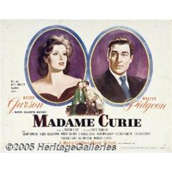 <B>Madame Curie (MGM, 1943)</B></I> Half Sheet (22" X 28"). "Mr. and Mrs. Miniver together again." Well, not quite. This MGM biopic was the third of seven pairings of Greer Garson and Walter Pidgeon. At the turn of the century, young physics student Marie (Garson) is paired in the lab with Pierre Curie (Pidgeon). She finally breaks through Pierre's shyness, and they get married. After their idyllic honeymoon, they make their life's work the struggle to isolate radium. Just at the point that success comes, Pierre is suddenly killed in an accident. This half sheet has beautiful portraits of Garson and Pidgeon. Pinholes, edge wear, small tears, and soiling. Fine+.