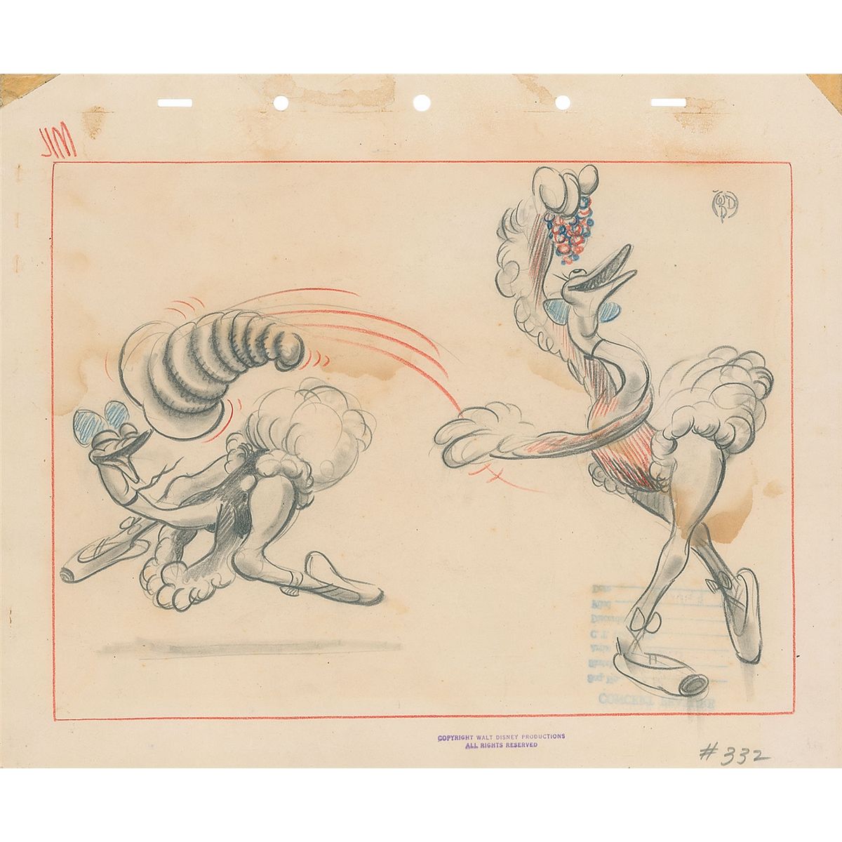 (Walt Disney Studios, 1940) Original concept storyboard drawing featuring Madame Upanova and Ostrich from Fantasia, showing them dancing and jumping in exquisite detail, drawn in a manner that radiates animated movement. Accomplished in graphite and colored pencil on untrimmed 12 x 10 animation paper. Images measure 4.5 x 4.5 and 5 x 7.5. The sheet bears a Courvoisier Galleries Walt Disney Productions ink stamp at the bottom. A few stains and slight show-through from an ink stamp to reverse, otherwise fine condition. Madame Upanova was in the segment of Fantasia entitled ‘Dance of the Hours,’ and the ostriches pursue her in hopes of getting her grapes, as seen in this beautiful production sketch.