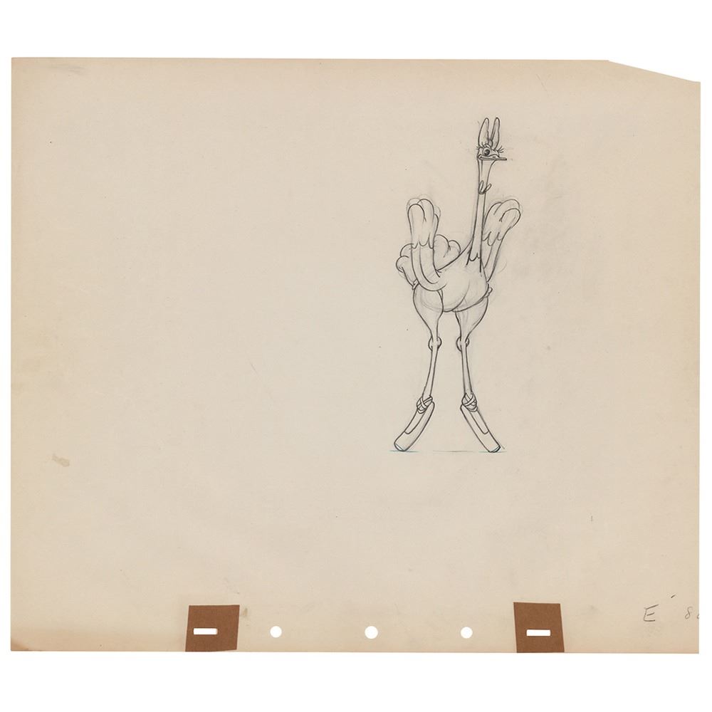 (Walt Disney Studios, 1940) Original production drawing featuring Madame Upanova from the 'Pastoral Symphony' segment of Fantasia, which depicts the ballet-dancing ostrich in a fine full-length pose. Accomplished in graphite on 14.5 x 12.5 animation paper. Image measures 2.75 x 7. In fine condition, with a clipped corner.