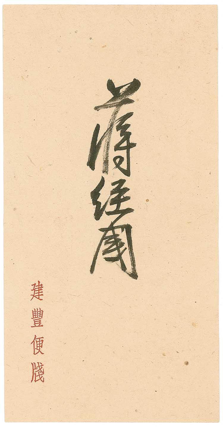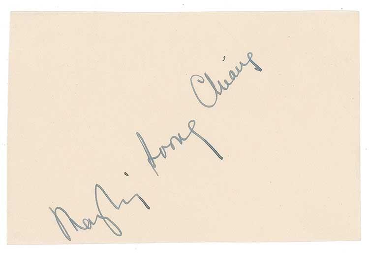 Bold ink signature of Chiang Kai-Shek, in Chinese, on an off-white 3 x 5.75 off-white sheet; and an ink signature of Madame Chiang Kai-Shek on an off-white slip. Accompanied by the original letter of transmittal, in Chinese, as well as the original mailing envelope postmarked 1952. In fine condition, with several horizontal folds to Chiang Kai Shek’s slip. RRAuction COA.