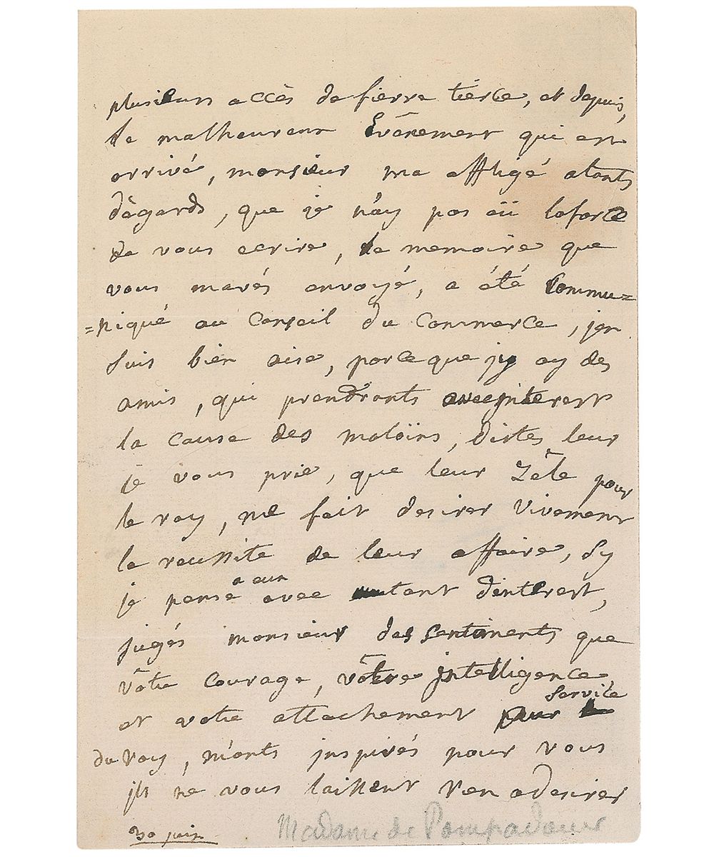 Member of the French court (1721–1764) who was the chief mistress of Louis XV from 1745 to her death. Rare partial autograph letter, in French, one page, 4.25 x 6.5, June 30. Portion of a larger letter to the Duke d’Aiguillon. In part (translated): “Several attacks of very severe fever, and the unhappy event that happened, Monsieur, have afflicted me in every respect, so that I have not had the strength to write you. The memorandum that you sent me has been transmitted to the Council of Commerce, I am very glad of that, because I have friends there who will take interest in the cause of the Malouns [the inhabitants of Saint-Malo]; tell them, I pray you, that their zeal for the King makes me strongly desire the success of their enterprise; if I think about them with so much concern, judge, Monsieur, of the sentiments that your courage, your intelligence, and your attachment to the service of the King have inspired in me on your behalf; they do not leave anything to be desired.” Reverse of second integral page bears an address panel in another hand as well as a mostly intact red wax seal. In fine condition, with a pencil notation along bottom edge.