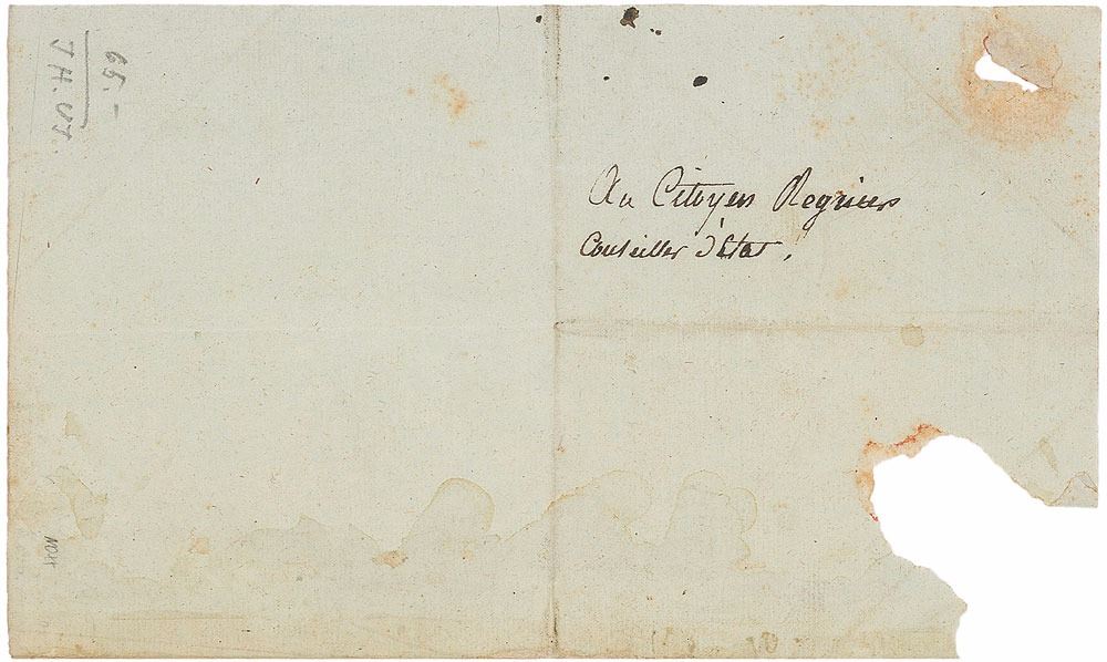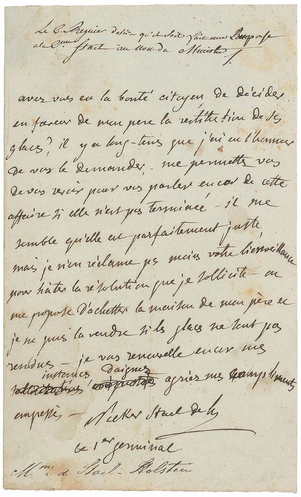 Anne Louise Germaine de Stael-Holstein (1766–1817), known as Madame de Stael, was a Swiss author who played an integral part in directing the literary tastes of Europeans at the turn of the 19th century.  Scarce ALS in French, signed "Necker Stael de H," one page, 4.25 x 7.25, no date. Untranslated letter to state councilor Claude Ambroise Regnier regarding the sale of her father's house. Reverse of the second integral page bears an address panel accomplished in another hand. In very good condition, with intersecting folds and scattered staining.
