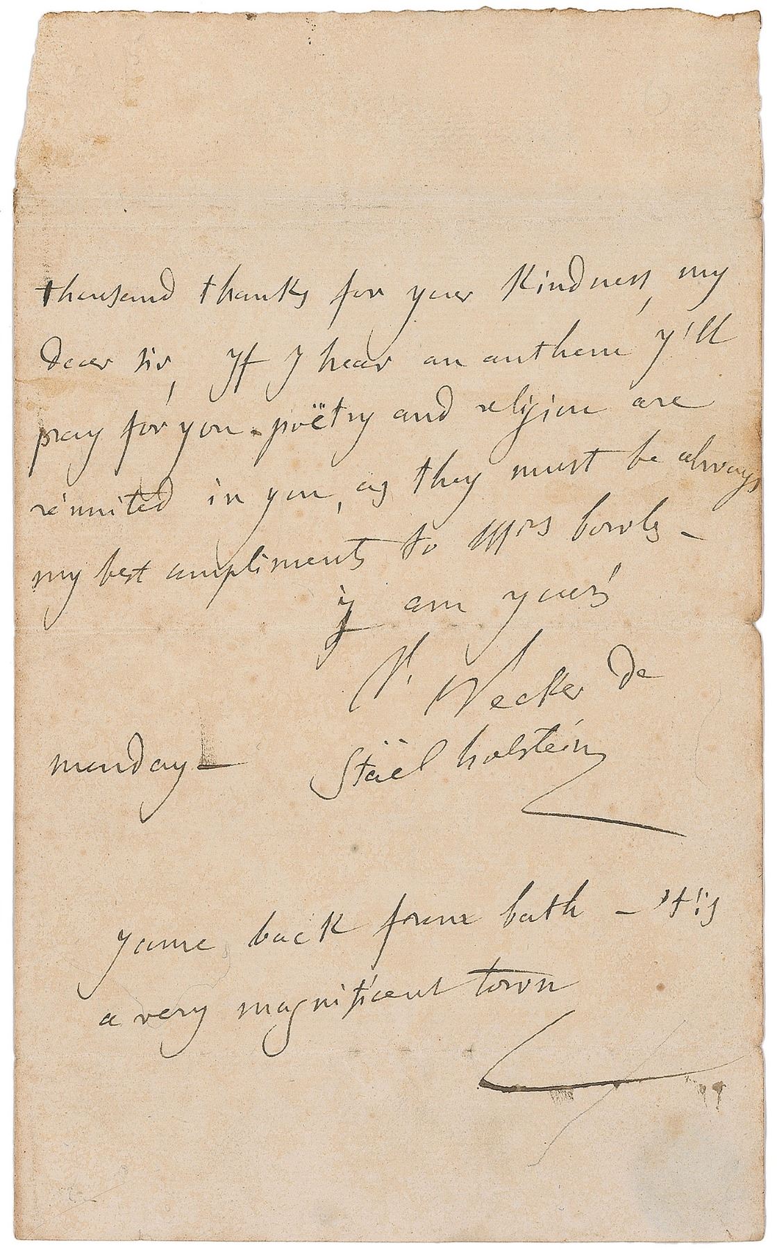 Anne Louise Germaine de Stael-Holstein (1766–1817), known as Madame de Stael, was a Swiss author who played an integral part in directing the literary tastes of Europeans at the turn of the 19th century. ALS, signed “A. Necker de Stael Holstein,” one page, 4.5 x 7.5, no date. Letter of thanks to Reverend Bowles, in full: “Thousand thanks for your kindness, my dear sir. If I hear an anthem I’ll pray for you, poetry and religion are reunited in you, as they must be always.” Stael also adds a brief unsigned postscript at the bottom. Reverse of partial second integral page bears an address panel in another hand. In very good to fine condition, with scattered creasing and mottled toning.