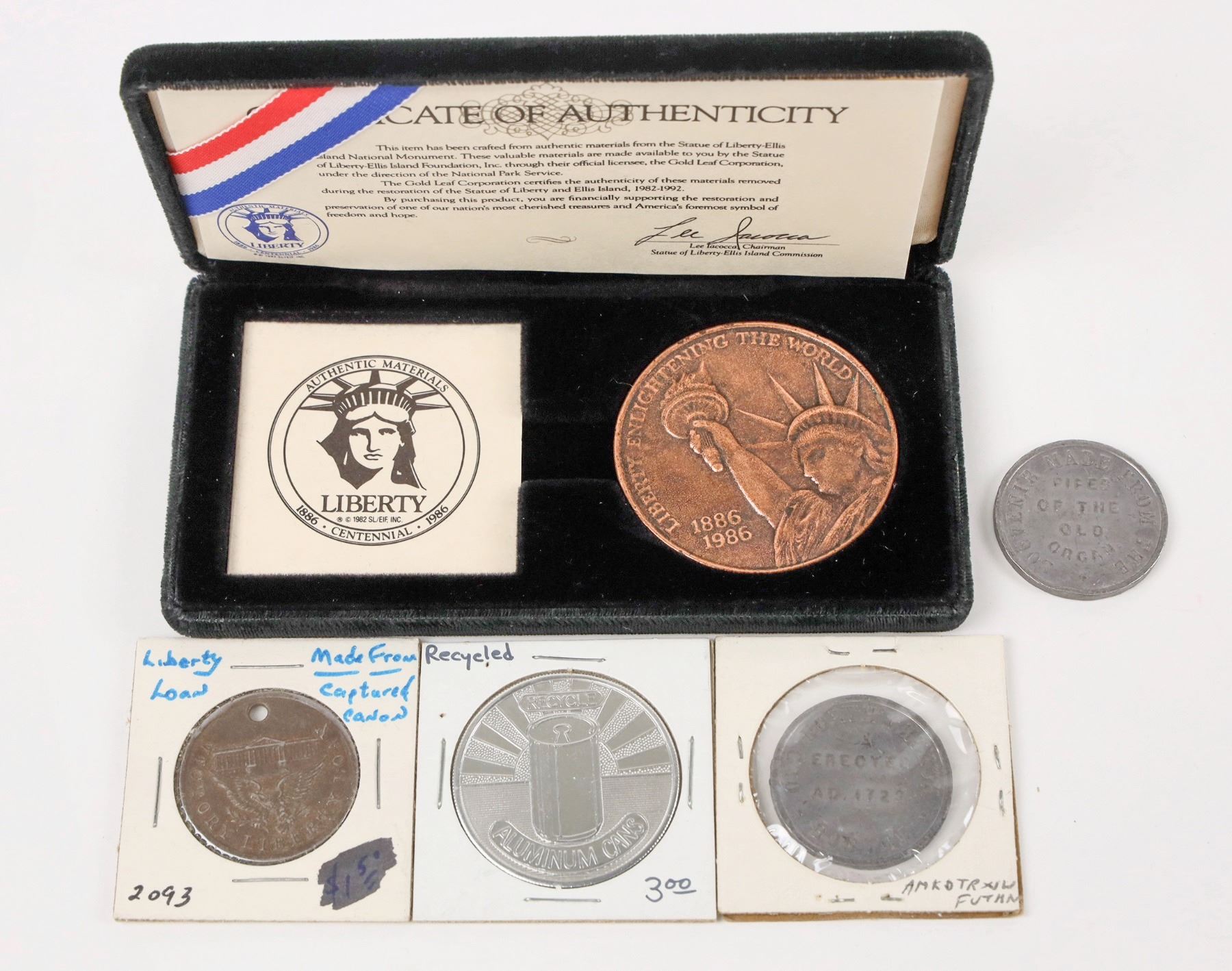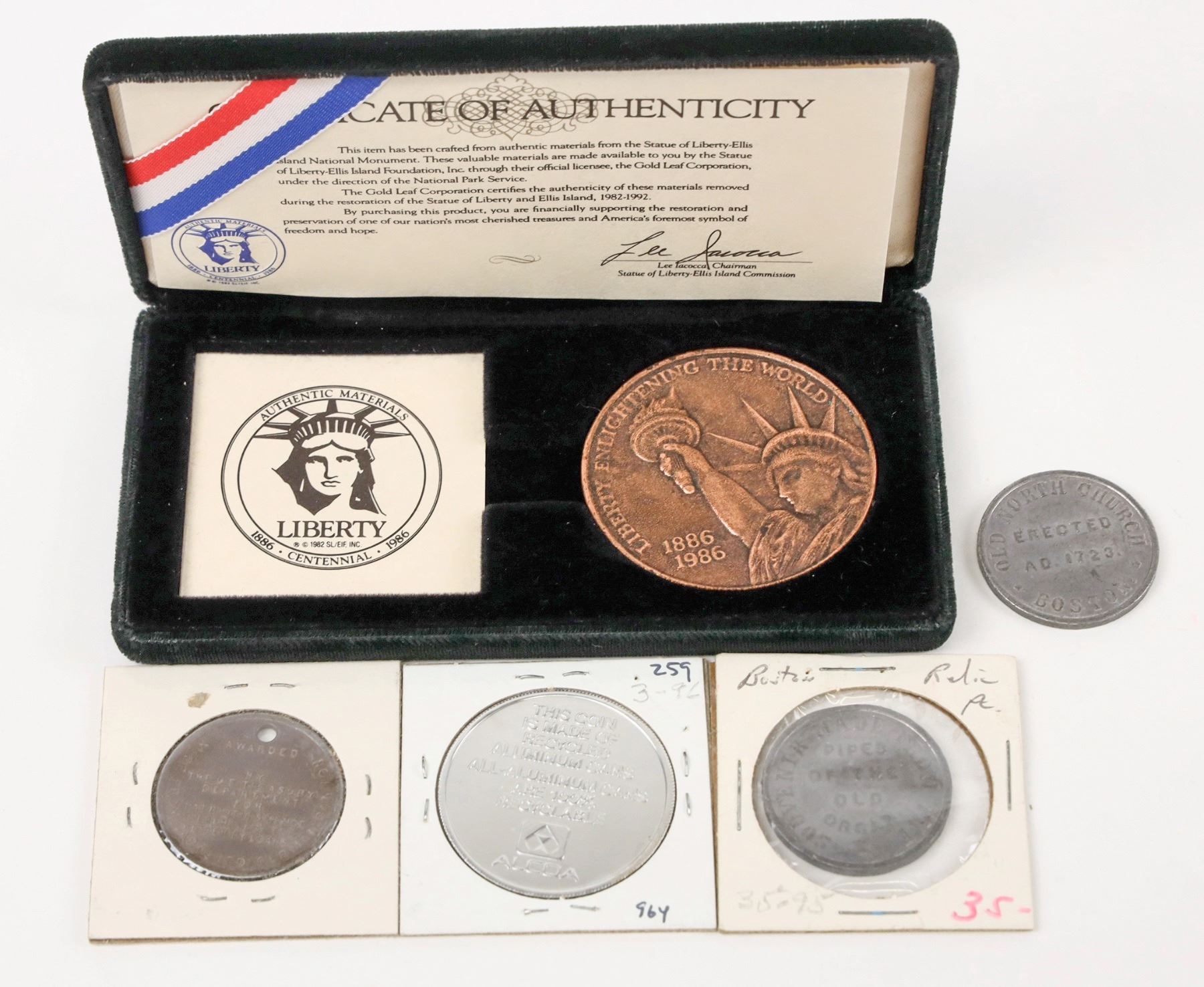 Lot of 5. Medals made from the material of the sites. 1. Medal made from the construction of the Statue of Liberty. 2. Treasury Dept. medal made from a German cannon. 3. Medal from the Old North Church. 4. Alcoa made from Aluminum 5.
