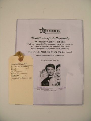 A bride-to-be has a problem when she asks her male friend to be her ""maid of honor", who is hell bent on marrying her himself! This is Hannah's (Michelle Monaghan) hero PJ top and pants from "Made of Honor" ((2008). Comes with a COA.