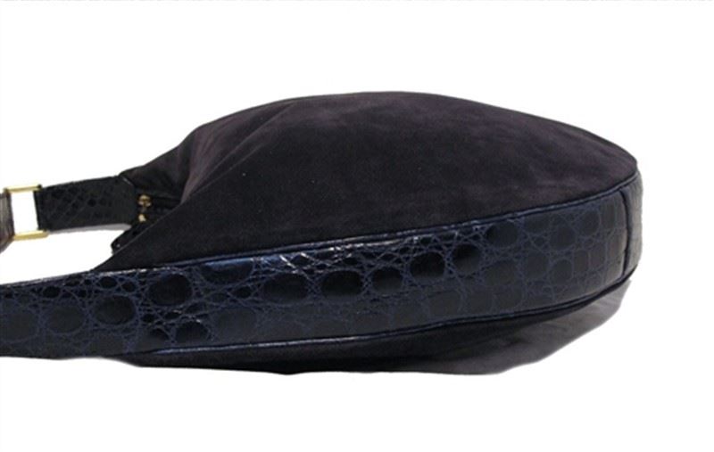 Gorgeous private label shoulder bag in mint condition. Exterior features navy blue suede trimmed with navy blue crocodile leather and gold hardware. Full top zip closure opens to a tan leather interior with 1 side zippered pocket that is satin lined. This piece has a manufactures tag inside that reads "Made in Italy exclusively for "Sandra's". It is in excellent condition and is a unique find for exotic skin enthusiasts. Purchase includes a dust cover. Measurements: 15''x11.5''x2'' 13.5'' shoulder drop #bags172