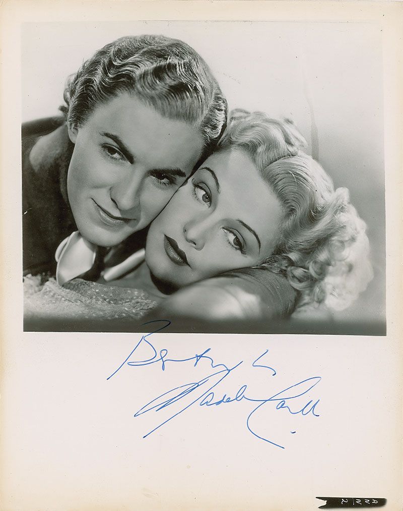 Vintage glossy 8 x 10 photo of Carroll cheek-to-cheek with Tyrone Power, signed in the large lower border in blue ink, “Best wishes, Madeleine Carroll.” Some scattered light creases and dings, mainly to edges, and some light toning to borders, otherwise fine condition.