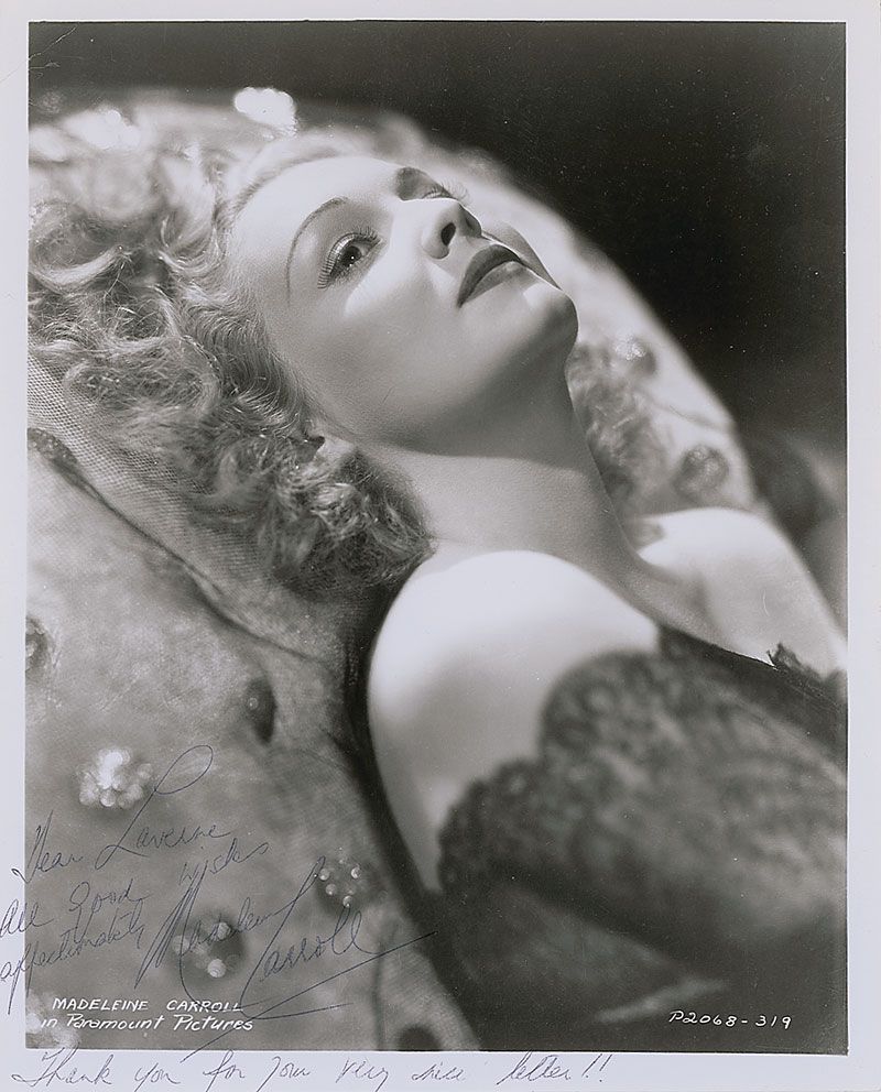 Glossy 8 x 10 photo, signed and inscribed in black ballpoint, “Dear Laverne, all good wishes, affectionately, Madeleine Carroll. Thank you for your very nice letter!!” In fine condition, with a crease and small edge tear to top left.
