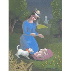 Madeleine Kula, dite Luka, 1894-1989 - GARDEN SCENE WITH A MOTHER WEARING BLUE DRESS KNEELING IN FRONT OF BABY, WITH DOG BY HER SIDE - oil on paper, 12.8 by 9.9ins., in glazed frame - signed lower right (see illustration). Est.£200/300