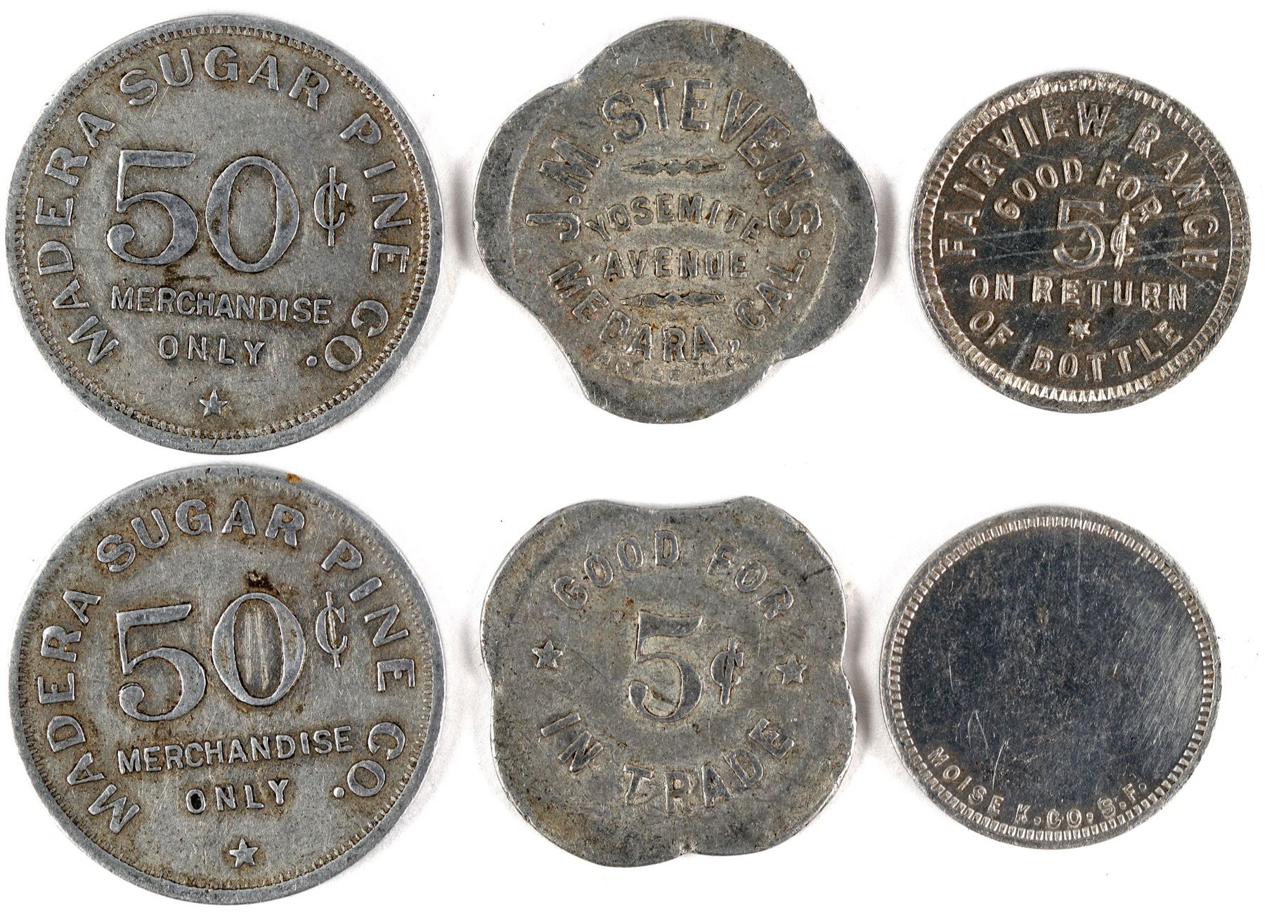 Lot of three: 1) Madera Sugar Pine Co. / 50c / Merchandise Only // (same); Rd., al., 30 mm. 2) J. M. Stevens / Yosemite / Avenue / Medara, Cal. // Good For / 5c / In Trade; Sc. (4), al., 28 mm. 3) Fairview Ranch / Good For / 5c / On Return / Of Bottle // (blank); Rd., Al., 24 mm.