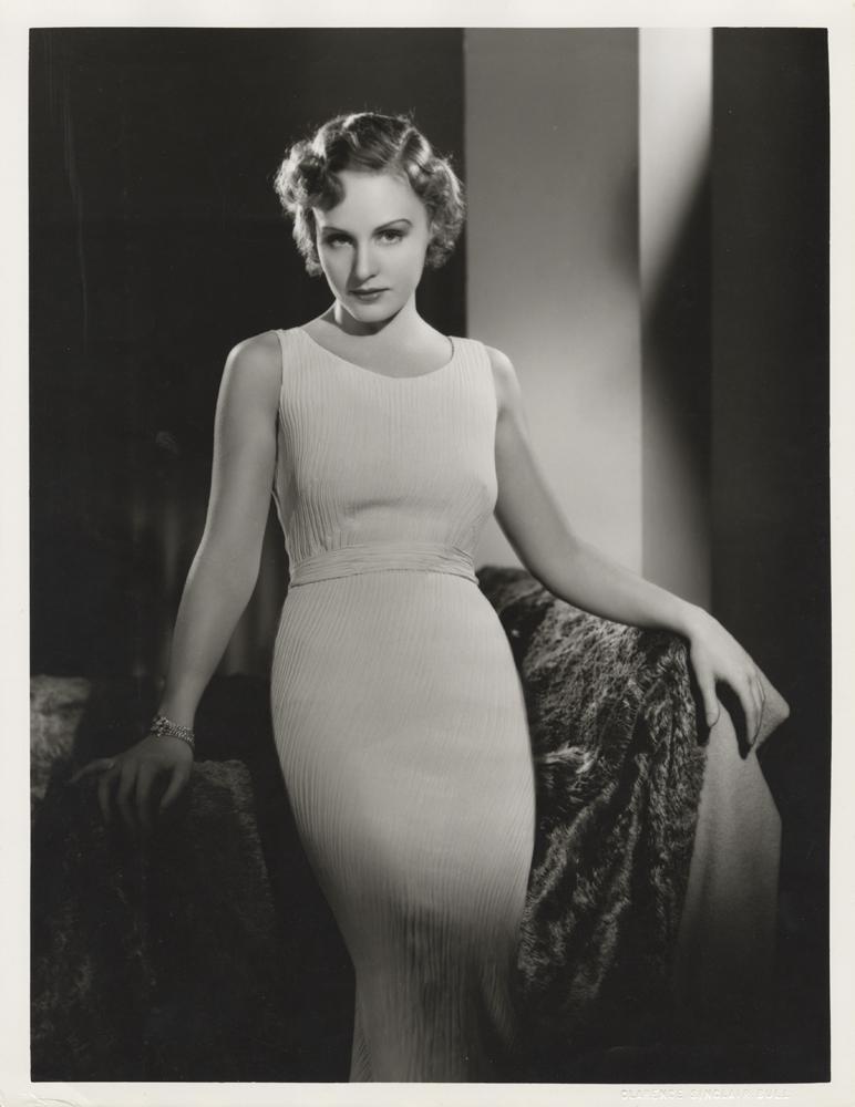 Gelatin silver semi-gloss double-weight 10 x 13 in. print of Madge Evans by Clarence Sinclair Bull; with blind embossed stamp, photographer and M-G-M rubber stamps and portrait number B5804 in pencil on the verso. Very fine; with light rippling at the lower edge, creasing at the lower left corner and light scuffing at the upper left.