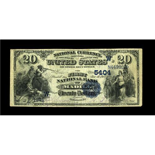 <B>Madill, OK</B></I> - $20 1882 Date Back Fr. 556 <B>The First NB</B></I> Ch. # (W)5404<BR>A just plain rare note which is one of only four examples known from here. With one a Territorial and another a serial number 1 $50 Date Back, both of which are ensconced in very long term holdings, the number of pieces truly available from here rapidly shrinks to two, with this specimen having been off the market since our consignor obtained it back in 1997. Nice <B>Fine++,</B></I> with purple stamp signatures.<BR><BR><b>Shipping:</b> Coin/Currency (<a target="_blank" href="http://www.heritageauctions.com/common/shipping.php">view shipping information</a>)
