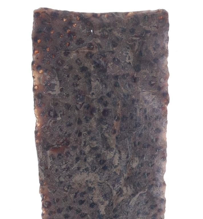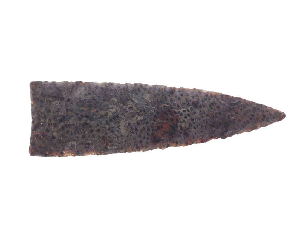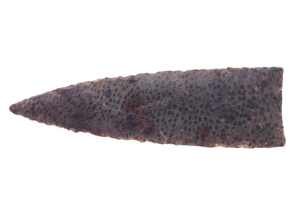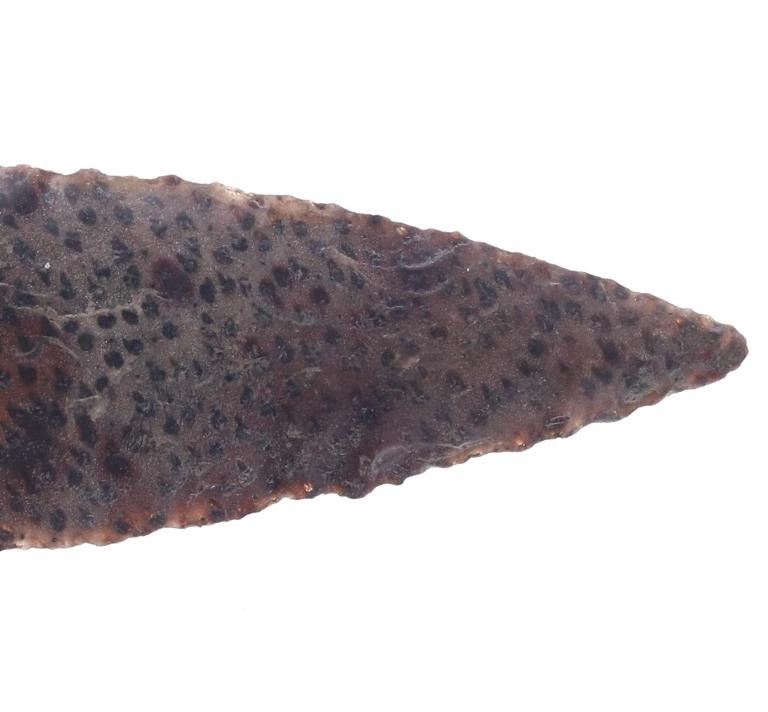 Featured in this lot is this Madison Blade Mississippian point aged from the Late Woodland to Mississippian period and from 1,100 - 300 B.P. The point shows a thin small triangular construction with a flattened cross section and shows a straight serrated blade. The point was knapped from a unusual stark reddish brown flint material. The condition of this point is good with no obvious signs of damage and in good overall condition. The measurements of this point are 2 7/8" x 7/8" x 1/4". This point was taken in Missouri.