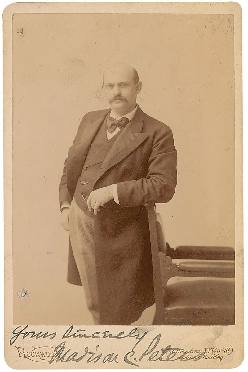 Influential clergyman (1859–1918) and pastor of the Bloomingdale Reformed Church. Original 4.25 x 6.5 cabinet photo by Rockwood of New York, signed in the lower border in black ink, “Yours sincerely, Madison C. Peters.” Some light soiling and two tack holes to the left border, otherwise fine condition.