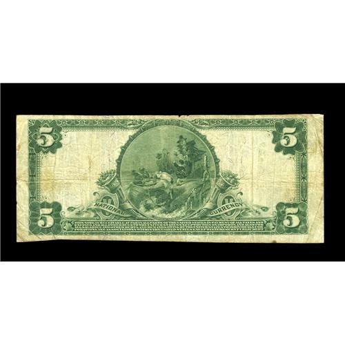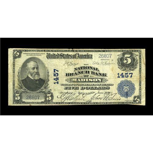 <B>Madison, IN</B></I> - $5 1902 Plain Back Fr. 598 <B>The National Branch Bank</B></I> Ch. # 1457<BR>This pleasing note retains the stamped signatures and is a near perfect match for the subsequent lot. A small bit of paper is missing from the top margin on this otherwise nice <B>Fine</B></I> graded note.