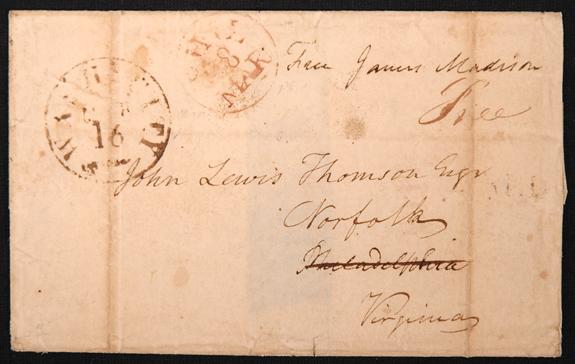 Madison, James (1751-1836) 4th President of the United States (1809-1817). Folded letter cover free franked "Free James Madison" in the upper right corner, with another "Free" just below, 3¼ x 5¼" folded. Addressed in Madison's hand to "John Lewis Thomason Esqr. Norfolk [Philadelphia is written, then marked out] Virginia." With two circlar cancellations. Docket notes, "From Mr. Madison -- March 1817 -- Washington." Very good; normal age toning and light soiling; a vertical fold runs through the "a" in "Madison."