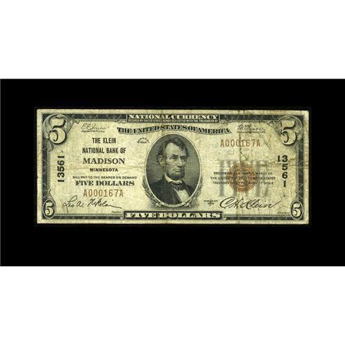<B>Madison, MN</B></I> - $5 1929 Ty. 1 <B>The Klein NB</B></I> Ch. # 13561<BR>This small bank had a total issue of just $110,000 in eight different varieties of the 1929 series. Tonight's <B>Very Good-Fine</B></I> example bears the signature of C.H. Klein as President of this family owned institution. A more elusive bank to locate than the census figures would indicate.