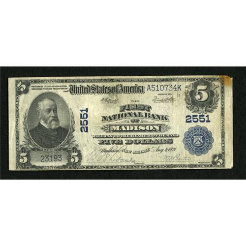 <B>Madison, NJ</B></I> - $5 1902 Plain Back Fr. 608 <B>The First NB</B></I> Ch. # 2551<BR> This stamped signatures remain strong on this scarce issue. <B>Fine, </B></I>with a minor rust stain in the upper right corner.<B> </B></I><BR><I>From The John Ameen Collection</B></I><BR><BR><b>Shipping:</b> Coins & Currency (<a target="_blank" href="http://www.heritageauctions.com/common/shipping.php">view shipping information</a>)