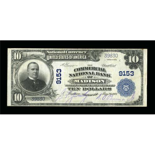 <B>Madison, WI</B></I> - $10 1902 Plain Back Fr. 626 <B>The Commercial NB</B></I> Ch. # 9153<BR> Some purple ink is visible on the back, perhaps transfer from the stamped purple signatures. Nice and bright, a pleasing capital note from the home of the Badgers. <B>Very Fine-Extremely Fine</B></I>.<BR><BR><b>Shipping:</b> Coins & Currency (<a target="_blank" href="http://www.heritageauctions.com/common/shipping.php">view shipping information</a>)