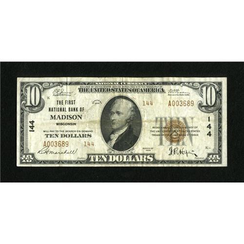 <B>Madison, WI</B></I> - $10 1929 Ty. 2 <B>The First NB</B></I> Ch. # 144<BR>Only about 10% of the Series 1929 notes in the census for this state capital bank are of the Type 2 persuasion. T.R. Hefty is the president. <B>Very Fine.</B></I><BR><BR><b>Shipping:</b> Coins & Currency (<a target="_blank" href="http://www.heritageauctions.com/common/shipping.php">view shipping information</a>)