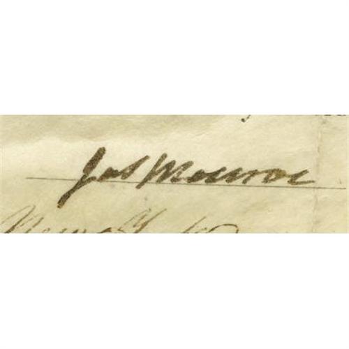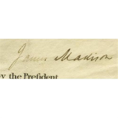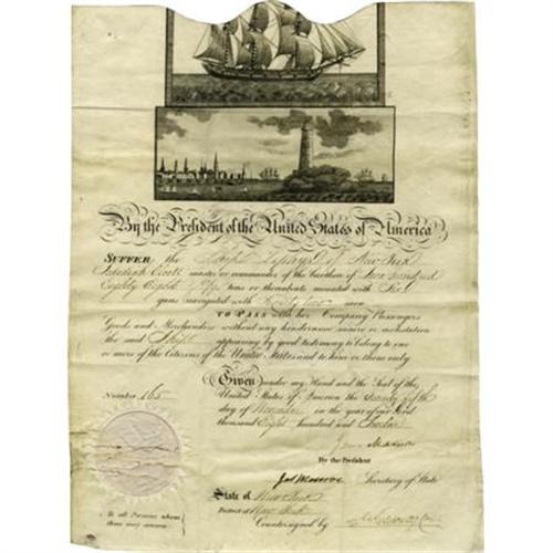 <B>James Madison and James Monroe Signed 1812 Ship's Passport.</B></I> Partly printed Document Signed “<I>James Madison</B></I>” as President and “<I>Jas Monroe</B></I>” as Secretary of State, one page, 11.25” x 14.75”. Washington , November 25, 1812. “<I>James</B></I>” is a tad light, but “<I>Madison</B></I>” and Monroe's signature are dark. On vellum with scalloped upper edge. Nautical vignettes at top; complete, but cracked, paper seal affixed with red wax at lower left. In part, “<I>Suffer the Ship Zephyr of New York Jedediah Olcott master or commander of the burthen of Two hundred Eighty Eight & 62/95 tons or thereabouts mounted with Six guns navigated with Twenty two men To Pass with her Company Passengers Goods and Merchandize without any hinderance seisure or molestation…</B></I>” The week this document was issued, during the War of 1812, American soldiers retreated from eastern Canada (November 23) while others attacked outlying British positions at Fort Erie (November 27). Docketed on verso. Usual folds, fine condition. Documents dated during the year 1812 signed by both Madison and Monroe are especially desirable.<BR><BR><b>Shipping:</b> Flat Material, Small (<a target="_blank" href="http://www.heritageauctions.com/common/shipping.php">view shipping information</a>)