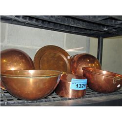 6pcs of solid copper ware; mixing bowl, pot, plate