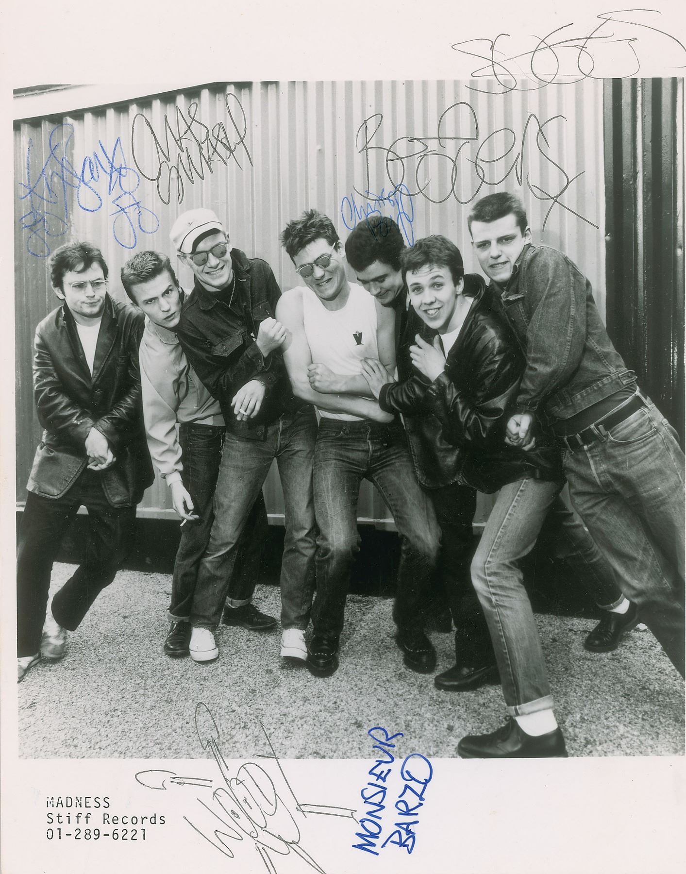Glossy 8 x 10 Stiff Records promotional photo of the English ska band Madness, signed in blue or black ballpoint by Mike Barson, Dan Woodgate, Graham "Suggs" McPherson, Mark Bedford, Chas Smash, Lee Thompson, and Chris Foreman. In fine condition, with a few small surface creases. Accompanied by a letter of provenance from the original recipient, who notes that the autographs were obtained at a recording studio around 1980–81.