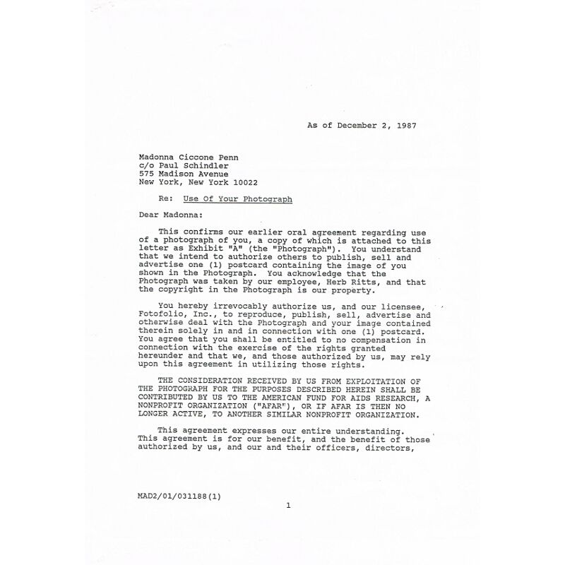 The legal document describes how Madonna relinquishes use of the image to a charitable non-profit organisation, The American Fund for AIDS research.