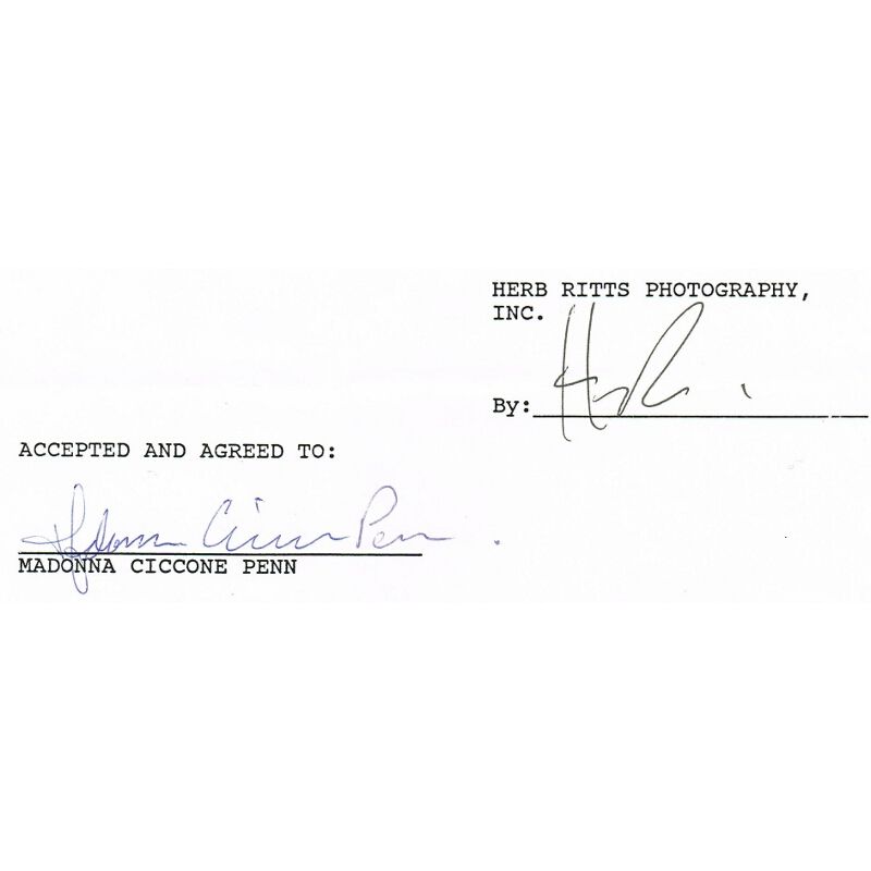 This two page legal document, dated 2 December 1987, measures 8.5x11 and is signed by both Madonna and Herb Ritts. Madonna's signature reads: Madonna Ciccone Penn".