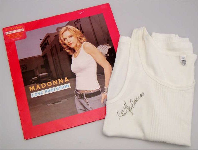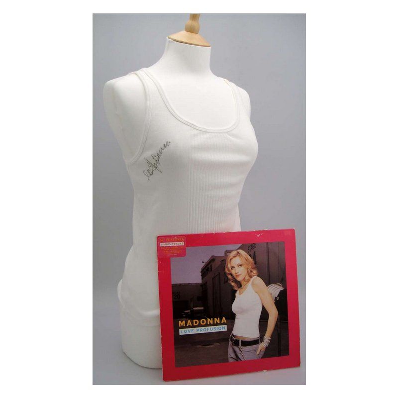 This signed, ribbed, white tank top was worn by Madonna for the original cover of her Love Profusion single, from her 2003 studio album American Life.