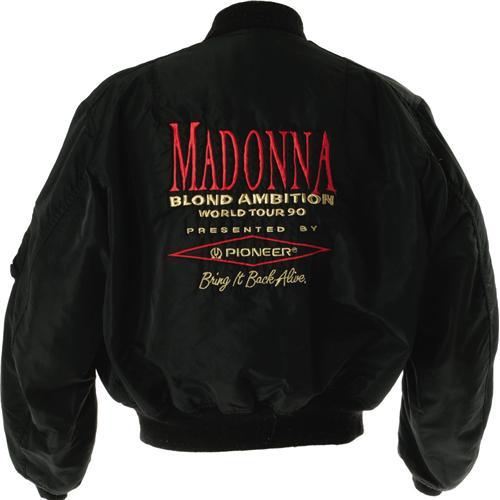 <B>Madonna "Blond Ambition" Tour Jacket.</B></I> A heavy black satin tour jacket with the Pioneer logo embroidered on the breast in gold thread and a large "Madonna Blond Ambition Tour" logo embroidered on the back. In Excellent condition.<I>From the Robert Johnson Memorabilia Collection.</B></I><BR><BR><b>Shipping:</b> Clothing, Costumes & Jerseys (<a target="_blank" href="http://www.heritageauctions.com/common/shipping.php">view shipping information</a>)