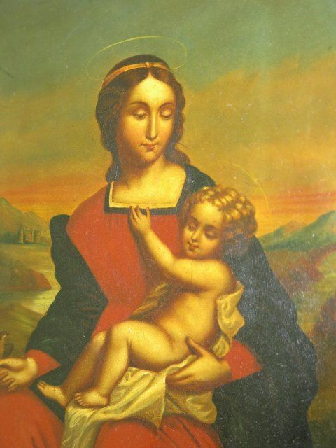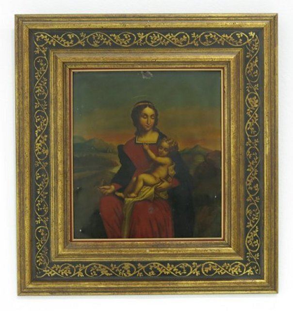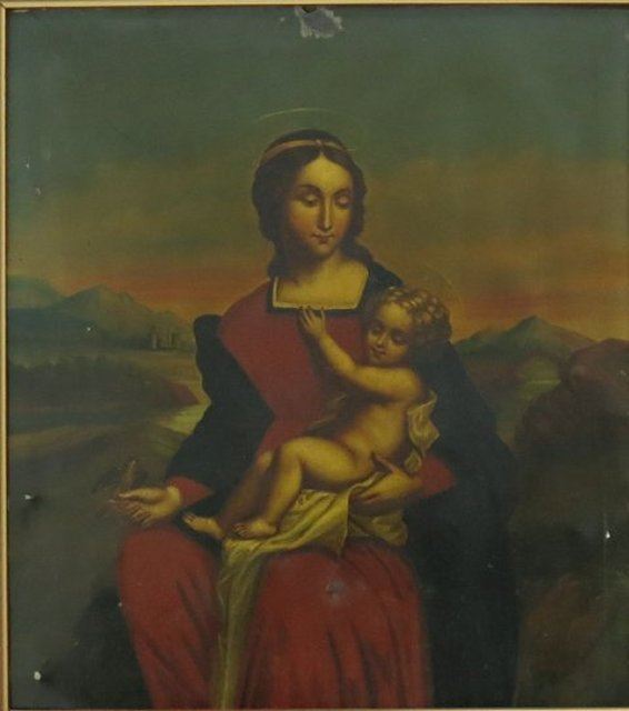 Painting on tin. 19th / 20th century. Approx. 9.5" H x 8.5" W unframed, 15.5" H x 14.5" W framed.